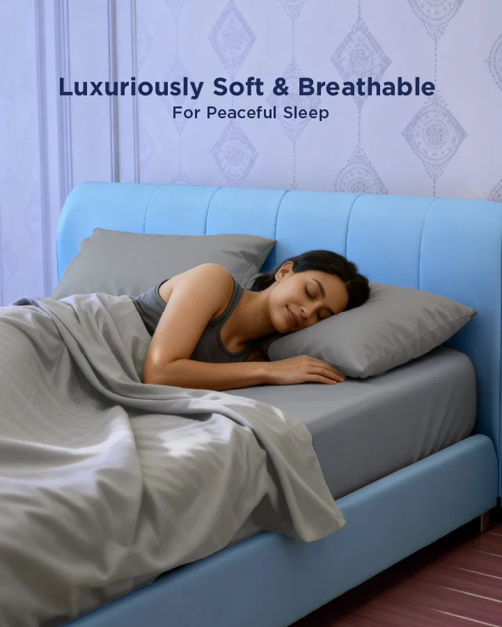 Plunge into an oasis of cooling comfort with The Sleep Company’s Glacier Thermo Fitted Sheets. Crafted from 100% pure cotton with a sateen weave for a refreshing, cool-to-touch sensation. These thermo-fitted sheets are thoughtfully designed with deep 12-inch pockets and 360° elasticated edges to fit across all mattress sizes. Tucking in neatly under the mattress, these fitted sheets offer an ultra-smooth, wrinkle-free finish for a luxuriously soft feel. Machine washable and OEKO-TEX® certified, these sheets are completely safe for your skin and easy to maintain.