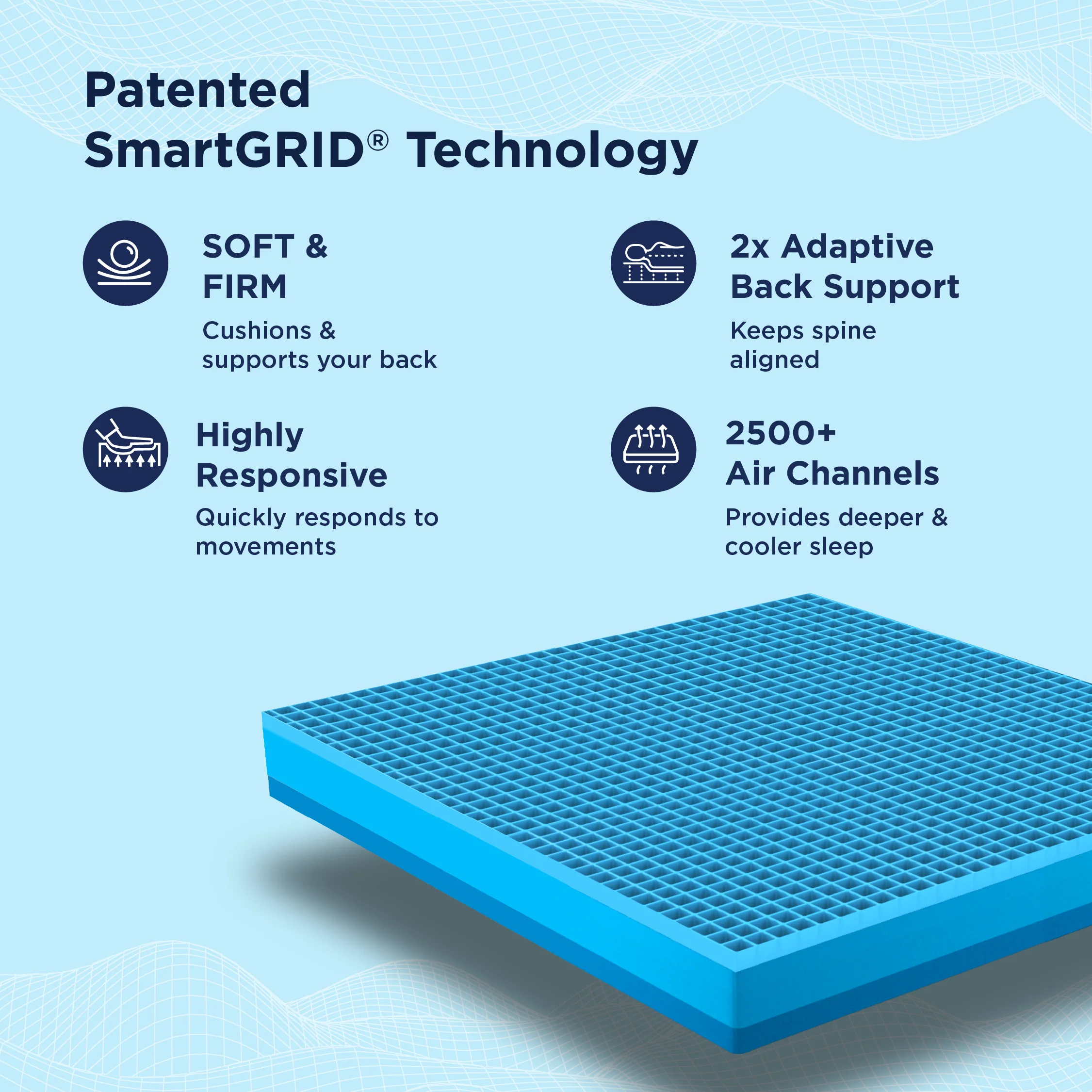 The Luxe Mattress has an extra plush layer called LuxioTec which enhances its core cushioning and gives a cloud-like sleeping experience. The SmartGRID Layer cradles pressure points and facilitates more breathability with its 2500+ Air channels.