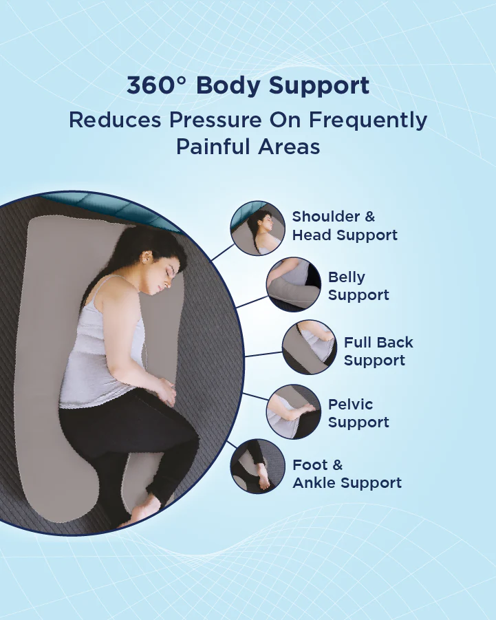 Introducing the Smart Pregnancy Pillow, your ultimate comfort companion throughout your pregnancy journey and even beyond that. Our pregnancy pillow is designed to provide support for the growing belly, back, and hips, allowing for a more comfortable sleep. A true saviour from swollen legs & body pain.
